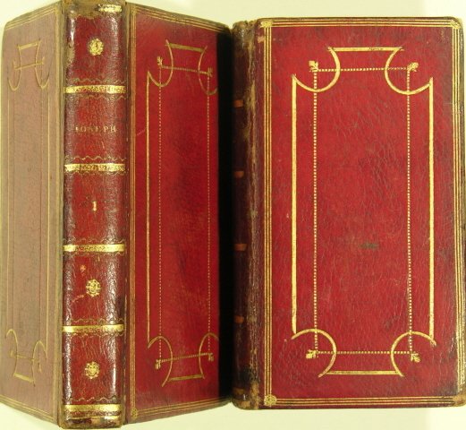 A Paris, chez Didot l’Aîné, 1786. 2 volumes petit in/12 en plein maroquin rouge, dos lisse à petits fers dorés, plat à triple filet et cadre, roulette intérieure, doré sur trois tranches, tome 1 : 194 p. et 4 planches hors-textes ; tome 2 : 271 p. et 5 planches hors texte de Marillier. Une coiffe abîmée, coins et mors usés. Bel ensemble cependant. A fine copy 12mo in red full marocco, smooth spine with gilt fillets, cover panelled in gilt, inner dentelle, three edges gilt, 9 engraved plates.