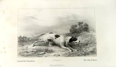 Paris, 1838-1839. In/8 reliure pleine toile verte simili-chagrin, dos lisse à titre et tomaison dorés, 12 gravures en noir dont beaucoup sur les chiens, culs de lampes, 433 pages. Petites usures sur les coiffes ; rousseurs. Louvetiers de la Nièvre, chasse au lièvre et à la bécasse en Suisse, chasse au loup en Volhynie, le chien Suéning.