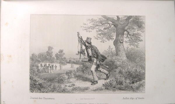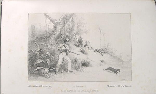 Journal des chasseurs, Paris, 1839-1840. In/8 reliure pleine toile verte simili-chagrin, dos lisse à titre et tomaison dorés, 11 gravures hors-texte, 428 pages. Rousseurs, manquent les pages 429 à 432. Histoires de braconniers (L. Bertrand), La bête du Gévaudan (Revoil), Chasse à l’hippopotame et l’éléphant (Lequevel de la Combe), chasse au blaireau ( ed. Le Masson),