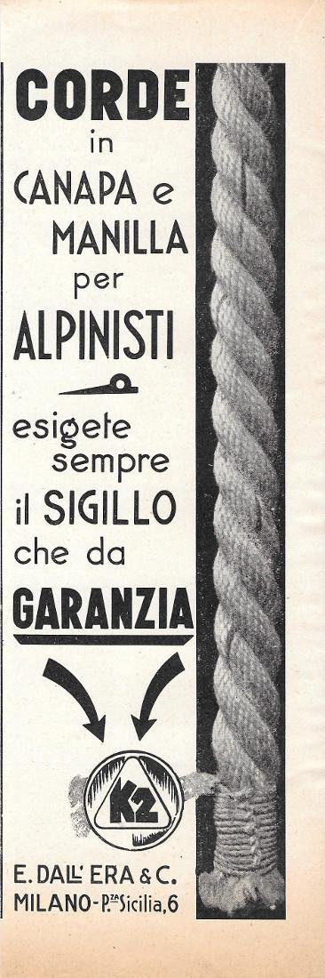 K2. Corde in canapa e manilla per alpinisti. E. Dall'Erba Milano. Advertising 1935