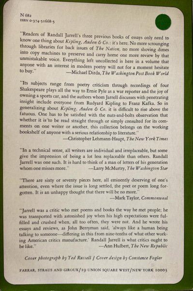 The fourth and final collection of Jarrell's essays and reviews reflects all the facets of the poet's talent. It contains virtually all the criticism that wasn't collected in the previous three volumes, Poetry and the Age (1953), A Sad Heart at the Supermarket (1962), and The Third Book of Criticism (1969). Its subjects range from poetry criticism to Ernie Pyle as a war reporter and the joy of owning a sports car.