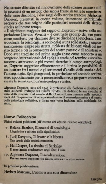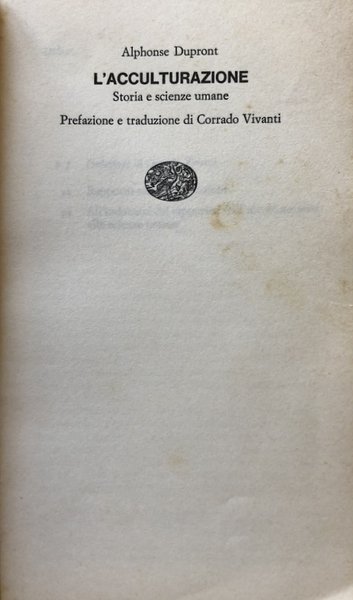 Nel serrato dibattito sul rinnovamento delle scienze umane e sulla necessità di un metodo che sappia fruire di tutte le esperienze delle varie discipline, i due saggi dello storico francese Alphonse Dupront, presentati in questo volume, immettono un'originale proposta che trae origine dalle particolari necessità della ricerca storica nel nostro tempo. «Il significato maggiore del saggio di Dupront - scrive nella sua prefazione Corrado Vivanti - è costituito proprio dal suo porsi come manifesto per chiamare diverse discipline (l'etnologia, l'antropologia, la psicologia, la sociologia) a una solidarietà, a una comunicazione sempre più stretta, richiesta dai bisogni vitali del nostro tempo e per la conoscenza del nostro passato e di noi stessi». Dopo aver tracciato nel primo saggio (nato come rapporto a un congresso internazionale del 1965) la storia del termine «acculturazione » attraverso le più recenti ricerche in campo antropologico, Dupront suggerisce efficacemente e illumina le possibilità di un incontro fra i metodi e gli strumenti d'analisi della storia e dell'antropologia. Egli giunge cosi, in particolare nel secondo scritto, steso appositamente per la presente edizione, a proporre concretamente la tematica di un'antropologia storica. Alphonse Dupront, nato nel 1905, è professore alla Sorbona e direttore di studi all'Ecole Pratique des Hautes Etudes. Ha dedicato le sue ricerche al mito della crociata e al mondo della Controriforma romana nella seconda metà del Cinquecento. Si occupa attualmente di semantica storica e di storia della psicologia collettiva, e dirige una vasta inchiesta sulla sociologia del sacro.