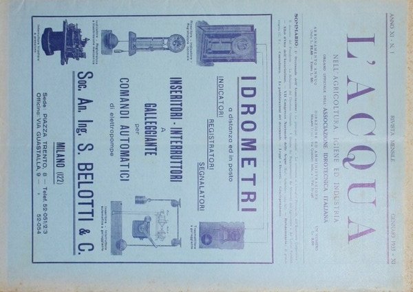 Nell'agricoltura, igiene ed industria - Rivista mensile. Organo ufficiale dell'Associazione idrotecnica italiana. Direttore Giovanni Bellincioni - Collana L'acqua. Anno XI - nn. 1-12 (Gennaio/Dicembre 1933) - in 4° - pp.228 (numerazione continua) - Brossura editoriale illustrata - Undici fascicoli - Immagini in b/n nel testo - Testo su due colonne