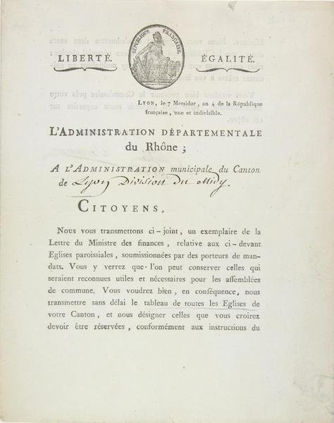 an 4 de la République, Lyon. Feuillet double imprimé et portant deux signatures ainsi qu'une mention manuscrite complétant le document, tampon de la République Française. Note accompagnant une letre du Ministre des finances relative aux Eglises paroissiales (assemblées de commune).