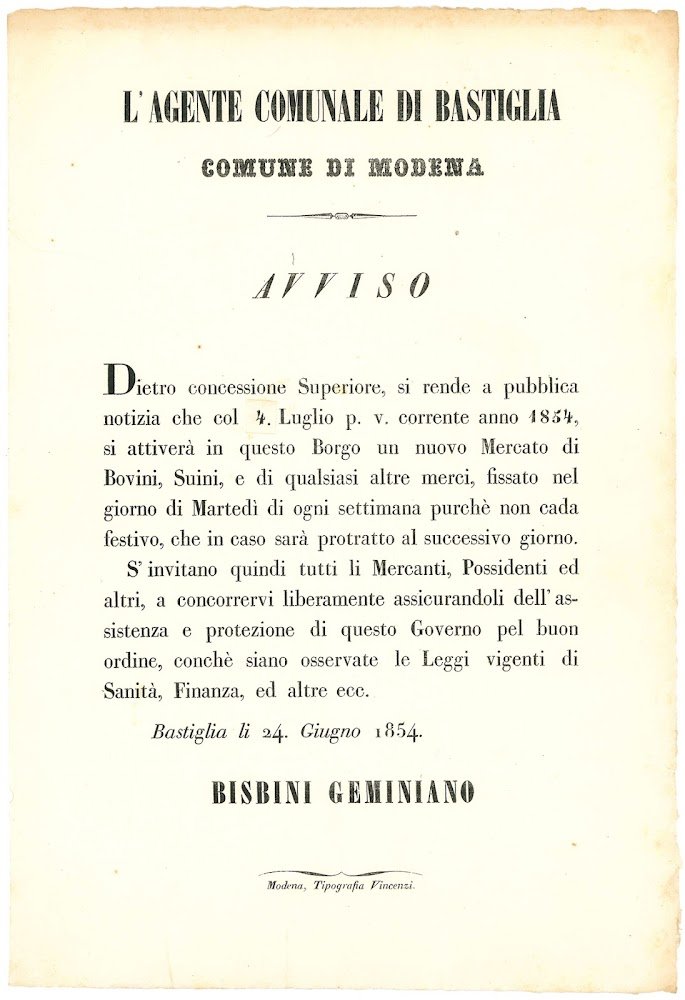 Foglio volante di mm. 320x220. Tracce di piegatura. Avviso concernente l'apertura di un "nuovo Mercato di Bovini, Suini, e di qualsiasi altre merci", a partire dal giorno 4 luglio 1854, da tenersi il martedì di ogni settimana purché non cada festivo.