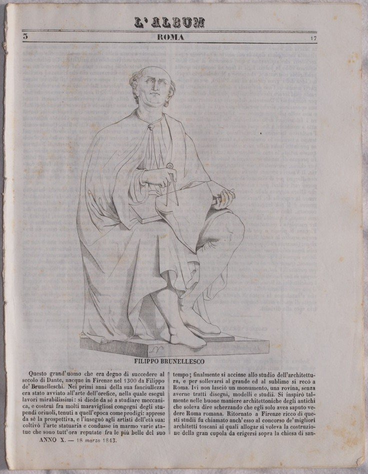 In 4. Dim. 27,5x22 cm. Pp. 8. Numero del 18 Marzo 1843 de L'Album di Roma, una rivista di letteratura, arte, viaggi e archeologia. In copertina è presente un incisione su Filippo Brunellesco; all'interno la cattedrale di Puy in Linguadoca ed il generale delle guardie imperiali dell'Indostan. All'interno presenti alcuni articoli: Filippo Brunellesco, cronaca Toscana: la giustizia; la cattedrale du Puy in Linguadoca; generale delle guardie imperiali dell'Indostan. In buone condizioni Brossura editoriale in buone condizioni generali con lievi usure al margine sinistro. Legatura quasi assente. All'interno le pagine si presentano in buone condizioni con fioriture, margini usurati. Interesting number of the 18th of march 1843 of the L'Album di Roma, a magazine of litterature, art, voyages and archeology. In the cover there is a beautiful engraving representing Filippo Brunellesco; inside the cathedral of Puy in LAnguedoc and the general of the imprial guards of Indostan. Inside different articles: Filippo Brunellesco, Tuscan chronicle: the justice; the ctahedral of Puy in Languedoc; general of imperial guards of Indostan. In good conditions Editorial cover in good general conditions slightly worn in the left edges. Binding is almost absent. Inside pages are in good conditions with foxings, worn edges.