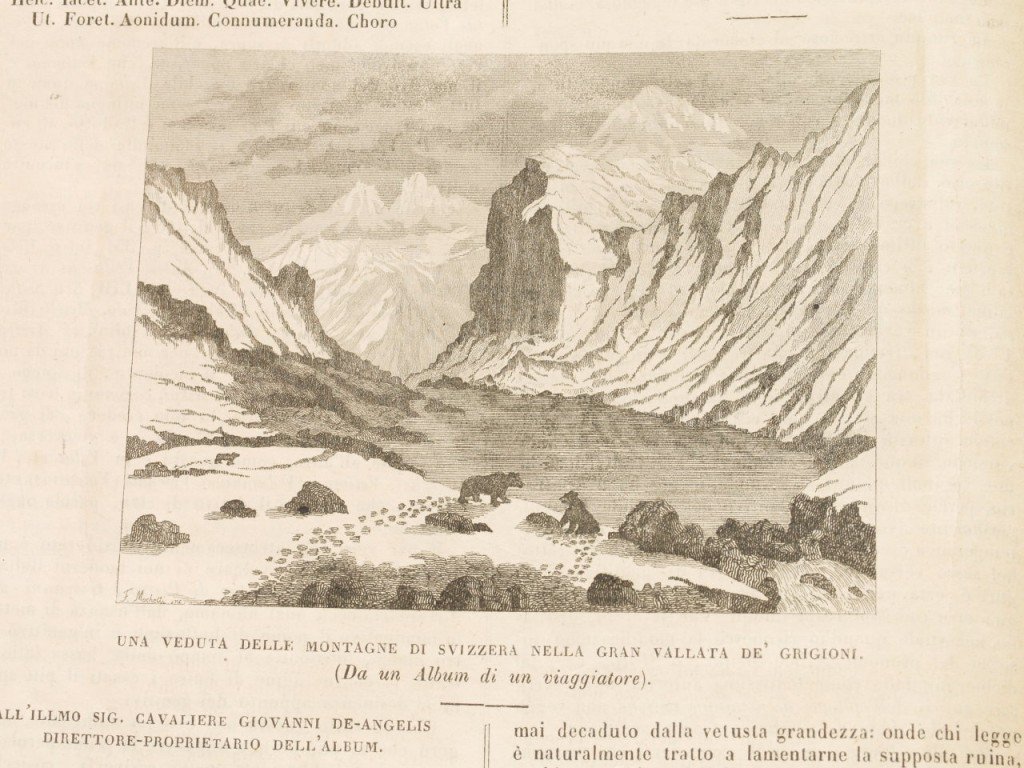 In 4. Dim. 27,5x22 cm. Pp. 8. Numero del 27 Gennaio 1855 de L'Album di Roma, una rivista di letteratura, arte, viaggi e archeologia. In copertina è presente un'incisione di una vignetta umoristica; all'interno la veduta delle montagne di Svizzera nella Gran Vallata dei Grigioni. All'interno presenti alcuni articoli: il carnevale nel mondo; necrologia di Vincenzo Persiani. In buone condizioni. Brossura editoriale in buone condizioni generali con lievi usure al margine sinistro. Legatura quasi assente. All'interno le pagine si presentano in buone condizioni con fioriture. Number of the 27 of January 1855 of the L'Album di Roma, a magazine of litterature, art, voyages and archeology. In the cover there is an engraving representing a humour vignette; inside a view of the Switzerland mountains in the Great Valley of Grigioni. Inside different articles: the carnival in the world; necrology of Vincenzo Persiani. In good conditions. Editorial cover in good general conditions slightly worn in the left edges. Binding is almost absent. Inside pages are in good conditions with foxings.