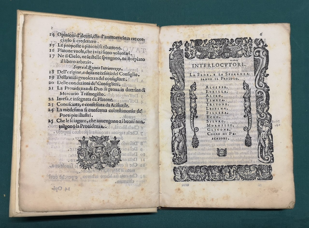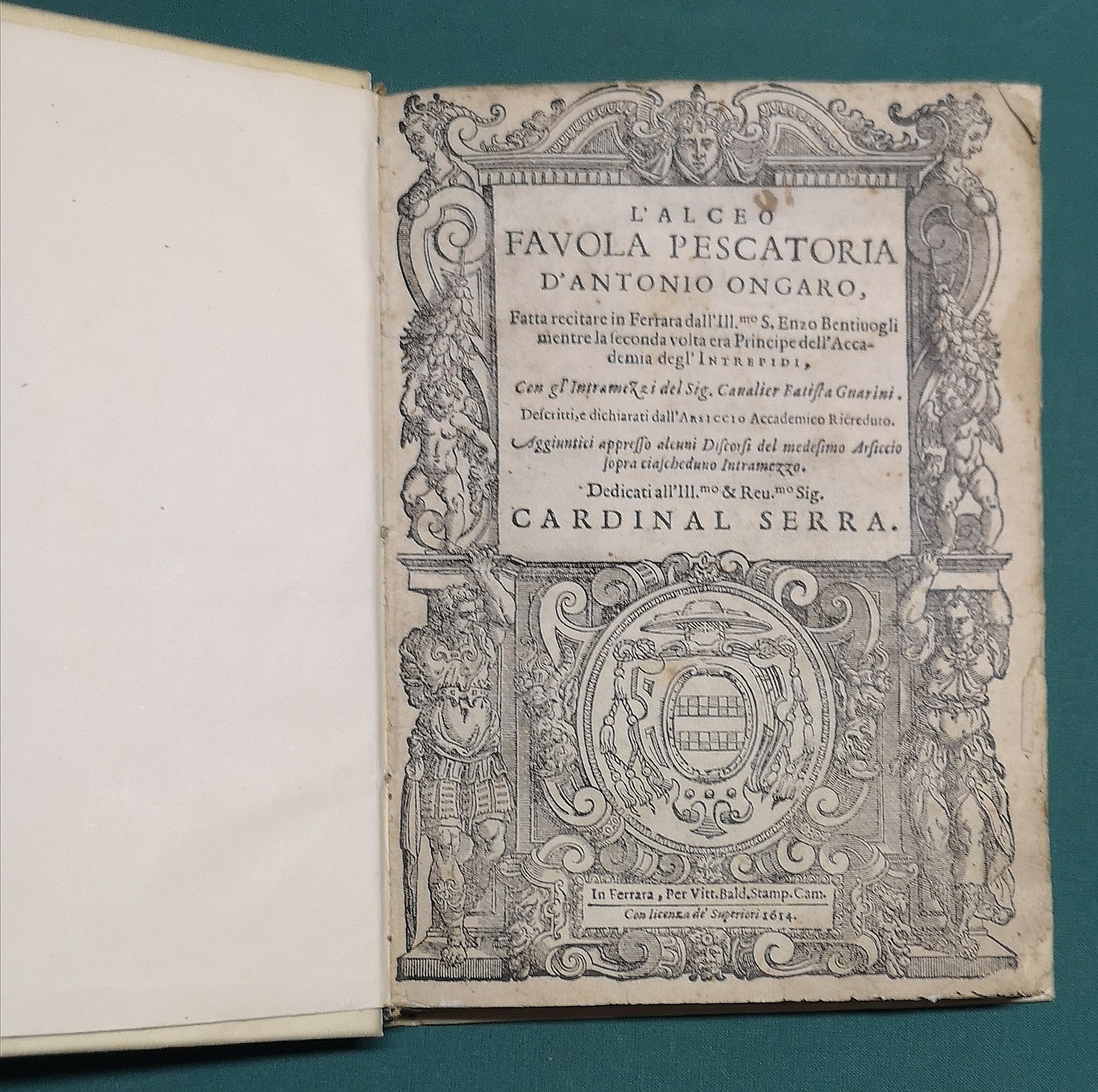 >in-4, numerazione a fogli e pagine: ff. 8, pp. 9-40, ff. 41-49, pp. 50-306, (2), testo in caratt. tondo e corsivo, leg. moderna in pergamena, titolo in oro al dorso. Titolo racchiuso in larga bordura silogr. fig., includente le armi del Card. Serra, cui l'opera è dedicata dallo stampatore, fregi ed iniz. silogr. Pastorale in cinque atti, in versi, una delle migliori imitazioni dell'Aminta di T. Tasso. Ebbe grande successo e numerose edizioni a partire dal 1582. Pregevole edizione, la prima con gli Intermezzi, i quali, sebbene portino il nome del Guarini, sono di Ottavio Magnanini (l'Arsiccio) che sopra ognuno fece delle dichiarazioni dettagliate ed assai stimate. Buon esemplare (lievi aloni d'umido). Allacci 20-23. Regenstein 447. Clubb 646. Gamba 1541. Salvioli 103: «Bella e pregevole edizione». BMC, XVII sec., 628. Michel-Michel VI, 35.