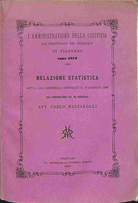 In 8 (cm 15,5 x 22,5), pp. 35 + (1 bianca). Ampia gora presente su tutte le pagine. Brossura editoriale. Relazione con dati statistici circa l'amministrazione giudiziaria nel circondario del Tribunale di Vigevano.