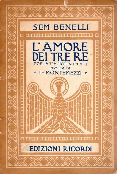 L'amore dei tre re. Poema tragico in tre atti, prrima edizione 1913, pp. 36, formato 13,5 x 20.<BR>Copertina morbida illustrata con titoli in blu al piatto anteriore. <BR>Piatto anteriore con piccoli segni di usura. Nel complesso condizioni molto buone