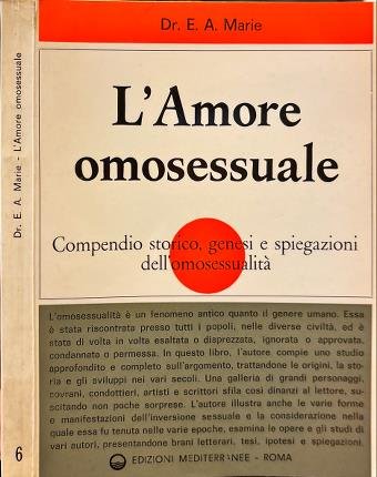 Compendio storico, genesi e spiegazioni dell'omosessualità. In 8° (cm 20,6 x 14,9), pp. 159. Bross. tit. nero al dorso bianco. Tagli e pp. bruniti. Condizioni molto buone.