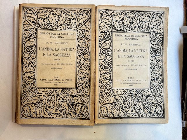 Due volumi in-8°, pp. 270, (2);181, (3), brossure editoriali con titolo entro cornice xilografica Ralph Waldo Emerson (Boston, 25 maggio 1803 - Concord, 27 aprile 1882) è stato un filosofo, scrittore, saggista e poeta statunitense. Fu la figura più influente del movimento trascendentalista americano del XIX secolo e ispiratore del pragmatismo; è considerato un campione dell'individualismo e un critico preveggente delle pressioni al conformismo che la società esercita sulle persone. Diffuse il suo pensiero attraverso influenti saggi e oltre 1500 conferenze che tenne in tutti gli Stati Uniti. Emerson è stato tra i primi a proporre un'etica individuale basata sulla fiducia in sé stessi e sulla discussione dei valori tradizionali, e uno dei pochi ad averlo fatto mantenendo il rispetto per la vita e l'esistenza, contrariamente, ad esempio, ad alcuni pensatori del nichilismo europeo. Nell'etica di Emerson si trova una singolare combinazione di relativismo (che lo avvicina a Montaigne) e perfezionismo (che lo avvicina alla tradizione stoica e alle radici puritane della cultura americana). Non a caso fu definito dai suoi contemporanei 'Plotino-Montaigne'. L'asse portante del suo pensiero fu la definizione di 'Superanima', descritta come una forza superiore che vigila e interviene sulla realtà, sul genio degli uomini, sulla filosofia e sulla poesia, come una porta d'accesso alla verità, costituente la base della comunicazione tra gli uomini. La libertà degli uomini non è più, secondo Emerson, sfuggire o ribellarsi alla necessità e al senso del mondo, ma comprenderlo e accettarlo.