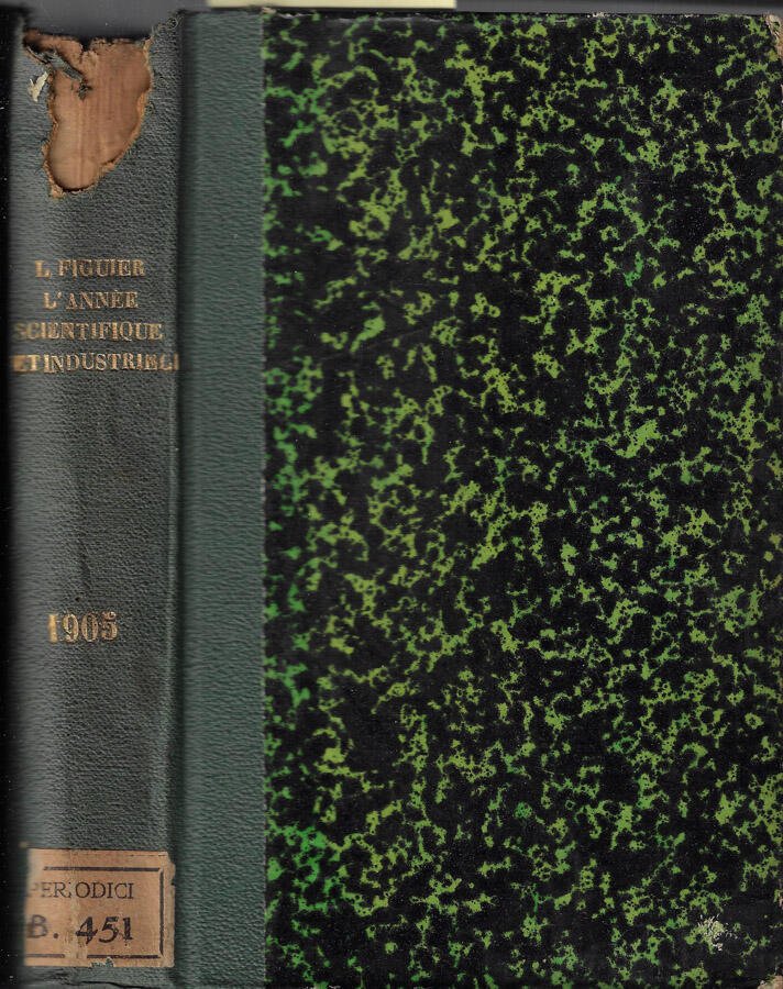 Volume successivamente rilegato raccogliente l'anno 49° 1905 de "L'annee scientifique et industrielle". Lingua francese. Coperta rigida in mezza tela presentante abrasioni ai margini con piccola mancanza alla cuffia superiore e leggere tracce di usura da sfregamento ai piatti; etichetta di catalogazione al piede ed alla controguardia. Il volume potrebbe contenere timbri ed etichette dell'Istituto Veneto, regolarmente acquisito dalla nostra libreria. Pagine fruibili anche se leggermente ingiallite dal tempo in particolare ai tagli e sporadicamente fiorite; bordi a barbe non impedenti la fruibilità e fogli intonsi. Lieve ondulazione delle pagine dovuta a minima e naturale umidità precedente non impedente la fruibilità. Numero pagine 383.