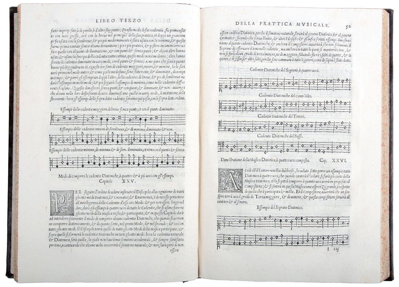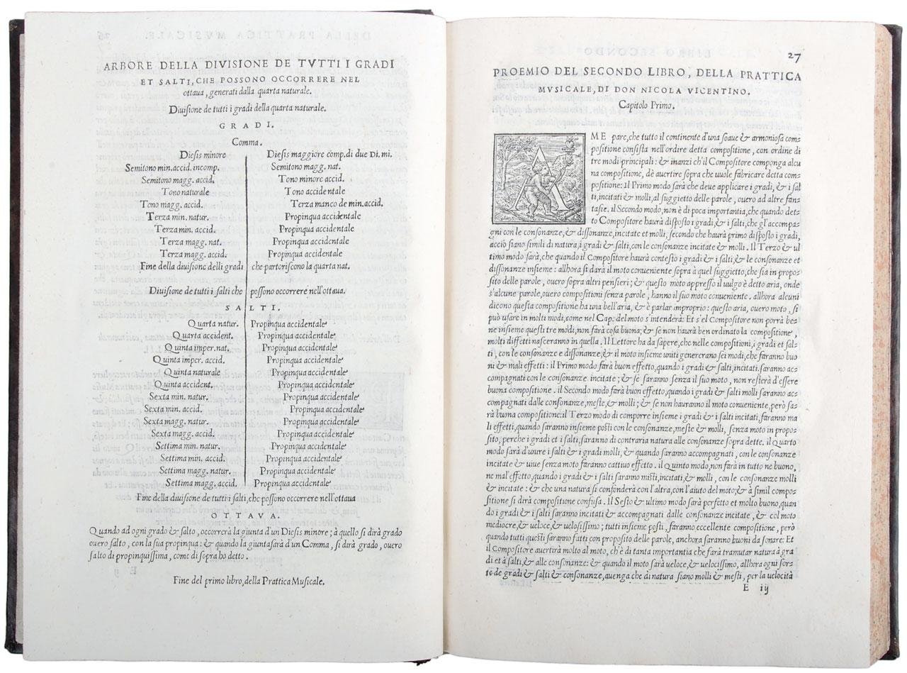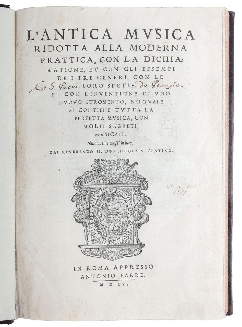 VERY RARE FIRST EDITION, first issue (the work was re-issued with just the date changed on the title page in 1557) of one of the most influential music theory books of the sixteenth century, dedicated to Cardinal Ippolito II d'Este. The Renaissance musicologist Edward Lowinsky (1967) acknowledges Vicentino as “the greatest revolutionary of the sixteenth century [...] The epochal significance of his treatise lies in the fact that here is the first esthetics of music in which every element of sound: melody, harmony, rhythm, texture, choice of instruments, manner of performance is critically examined as to its expressive potential, and in which the relativity of each element in varying contexts is demonstrated” (E.E. Lowinsky, The musical avant-garde of the Renaissance or: The peril and profit of foresight, in: “Art, science and history in the Renais- sance”, C. S. Singleton, ed., Baltimore, MD , 1967, p. 133).