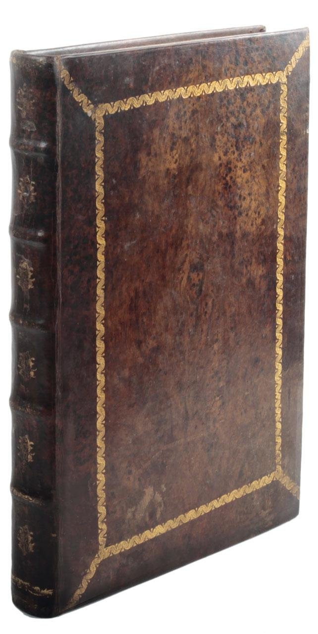 Folio (287x194 mm). 146, [6] leaves and [8] woodcut folding plates. Collation: A-Z6 AA6 BB8. With the printer's device on the title page showing Orpheus under a tree playing the viola and the author's portrait, at the age of 44, printed on its verso, music notation in text. Old polished gilt calf, marbled edges, contemporary ownership's inscription on the title page: ‘Est S. Petri de Perusio'; below the initials ‘D.d.M.' and the date 1857, Small marginal tear to leaf D4 with no damage to the text, title page lightly soiled, but a very fine copy.