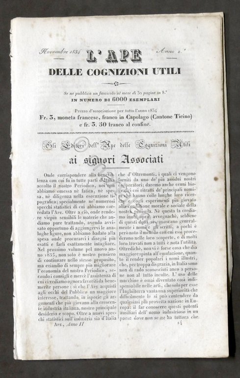 L'Ape delle cognizioni utili ossia scelta delle migliori notizie, invenzioni, cognizioni e scoperte - Anno II - Fascicolo Novembre 1834 Pag. 30 con illustrazione Copertina morbida - Testo in italiano. Condizioni buone. Copertina come da foto.