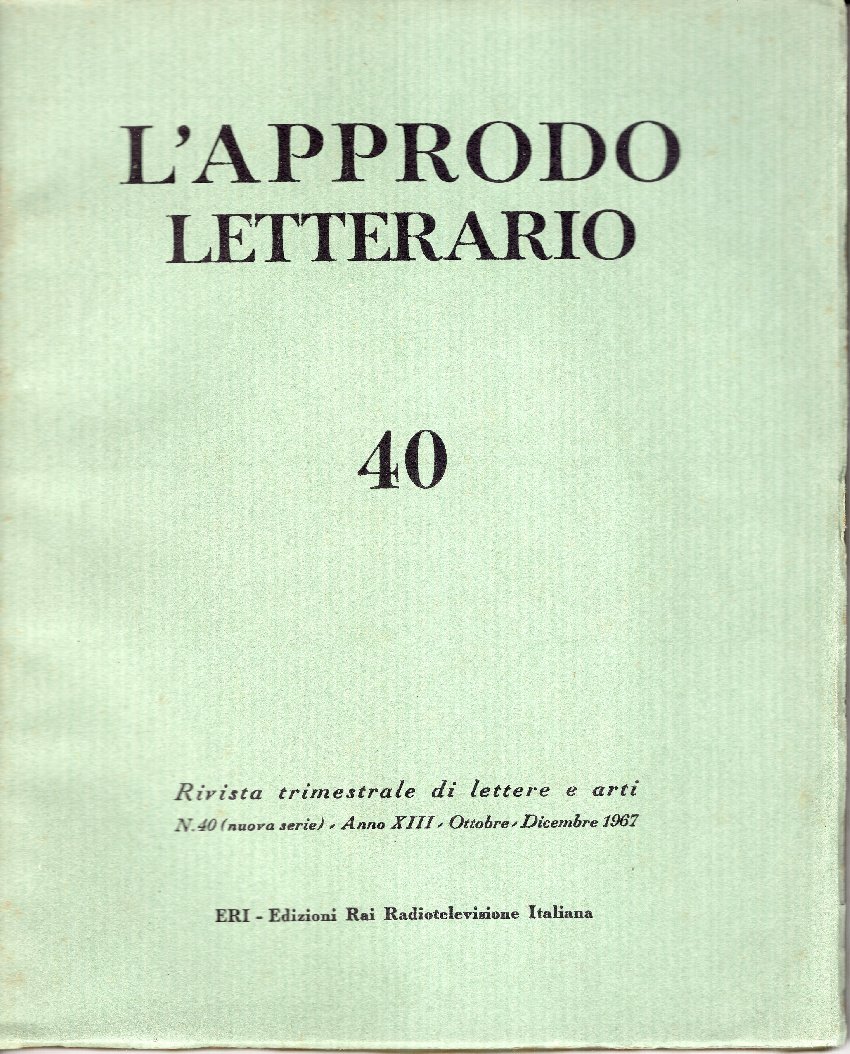 L'approdo letterario, trimestrale di lettere e arti n^ 40 ott-dic. 1967, contieme: omaggio a Cecchi, scritti di Carlo Bo, Praz, Noferi, A. Bertolucci, Cattaneo, Falqui, d'Amico, ecc. testimonianz e ricordi di Banti, Baldini, manzini, Piccioni, Missiroli, Bigongiari, Camerini, Blasetti, Marghieri; segue rassege su letterature di vari paesi e sull'arte | Libri antichi e moderni | AA.VV., ,AA.VV.