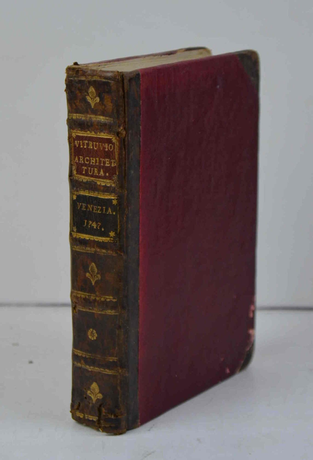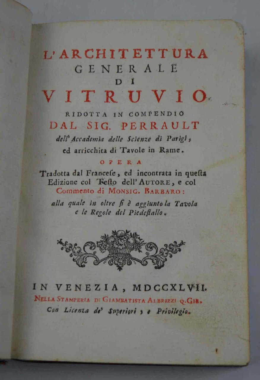 Cm. 16,5, pp. (44) 213 (30). Con bell'antiporta allegorica, frontespizio in rosso e nero e 12 tavole fuori testo, ciascuna accompagnata da una carta di spiegazione. Il tutto finemente inciso in rame. Legatura di poco posteriore in mezza pelle on punte, dorso a piccoli nervi con fregi in oro e titoli su doppio tassello. titoli nervi passanti e titoli manoscritti al dorso. Esemplare con pochi segni d'uso, piccoli difetti alle cuffie, complessivamente genuino e ben conservato e stampato su carta forte. Edizione originale della versione italiana del compendio di Vitruvio eseguito da Claude Perrault. L'appendice finale è un piccolo vocabolario dei termini di architettura. Cfr. Cicognara, 732 e Morazzoni p. 261.
