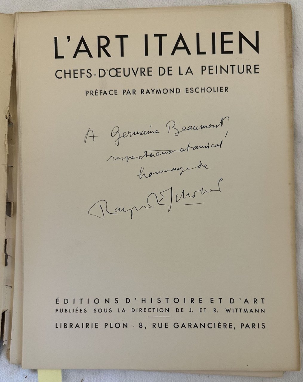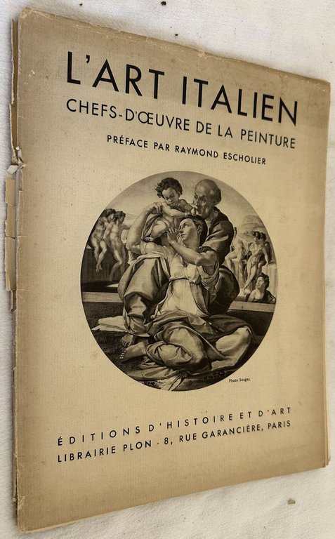 Edizione del 1935 di questo volume fotografico sui capolavori dela pittura italiana a cura di Raymond Escholier. Dedica dell'autore al frontespizio alla giornalista Germaine Beaumont (1890-1983). In discrete condizioni. Copertina editoriale in mediocri condizioni generali con usure e mancanze ai margini e dorso. Piatti staccati. Legatura assente. Pagine in buone condizioni. In 4. cm 29,5x22,5. Pp. (25).Edition of 1935 of this photographic volume about the masterpieces of italian art written by Raymond Escholier. Dedication fot he author in the title page to the journalist Germaine Beaumont (1890-1983). In fair conditions. Editorial cover in poor conditions lightly worn with lackings in the extremities. Plates are detached. Binding is missing. Pages in good conditions. In 4. cm 29,5x22,5. Pp. (25).