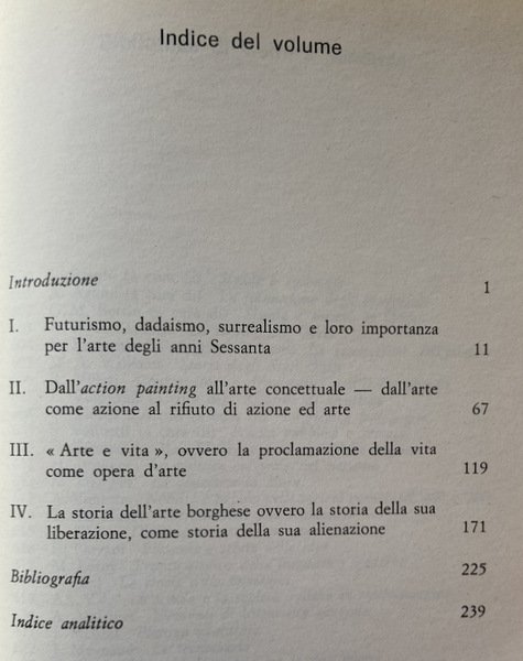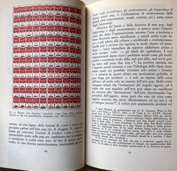 Soggetti: Saggistica, Critica d'arte, Saggi critici, Storia contemporanea, Capitalismo, Influenze culturali, Modernità, Modernismo, Movimenti e stili artistici, Concetto, Filosofia, Interpretazione, Avanguardia, Avanguardie artistiche, Pittura, Pittori, Scultura, Design, Urbanistica, Architettura, Stampa, Editoria, Riproducibilità, Fruizione, Contestazione, Società, Propaganda, Industrializzazione, Serialità, Produzione, Serie, Correnti artistiche, Astrattismo, Arte oggettuale, Ingrandimenti, Riproduzioni, Stilizzazione, Fumetti, Fotografia, Esibizione, Pubblico, Partecipazione, Corpo umano, Grafica, Graffiti, Street art, Graffitismo, Stati Uniti d'America, Russia, Unione Sovietica, Europa, Germania, Francia, Italia, Spagna, Fascismo, Politica, Novecento, Libri illustrati, Colori, Letteratura, Oggetti d'uso, Cronaca, Attualità, Opere, Barattolo, Minestra, Pubblicità, American Dream, John Rublowsky, Firma, Pop, Jean Baudrillard, Salvador Dalì, Roland Barthes, Barilli, Anni Sessanta, Anni Settanta, Collage, Berlino, Potere, Futuristi, Futurismo, Immagini, Joseph Beuys, Ambiente, Spazio, Minestra Campbell, Marilyn Monroe, Borghesia, Collezionismo, Mercato, Valore, Collezionisti, Case d'Asta, Parigi, Cultura, Noodle Soup, Estetica, Espressionismo, Rappresentazione, Fluxus, Mostre, Expo, Surrealismo, Natura, Musica, Funzione, Materiali, Monaco di Baviera, Colonia, Libertà, Cemento, Scienza, Economia, Scienze sociali, Analisi, Karl Mannheim, Ideologie politiche, Iring Fetscher, Karl Korsch, Classi sociali, Hebert Marcuse, Contesto storico, Gyorgy Lukacs, Marxismo, Progresso, Realismo, Happenings, Integrazione, Vita quotidiana, Musei, Autonomia, Stato, Wassili Kandisky, Wolf Vostell, Tommaso Marinetti, Carlo Carrà, Umberto Boccioni, Environments, Andy Warhol, Mistificazione, Realtà, Brillo Boxes, Roy Lichtenstein, The Refrigerator, Jackson Pollock, Marcel Duchamp, Marcel Jean, Mirò, Bambole, Karawane, Hugo Ball, Poesia musicale, Hans Harp, Dadaland, Reusch, Christo, Beat, Giocolieri, Fuoco, Klang-Szene, Elettronica, Acustica, Agenzie, Committenze, Investimenti, Messaggio, Proprietà capitalistica, Accumulazione, Profitto, Specializzazione, Libertà, Liberazione, Walter Aue, Weiner, Marshall McLuhan, Villaggio globale, Globalizzazione, Jurgen Wissmann, Allan Kaprow, Assurdo, Cubismo, Azione, Attivismo, Action Painting, Rifiuto, Alienazione, Bibliografia, Riferimento, Libri Vintage Fuori catalogo, Karl Marx, Mercificazione, Pablo Picasso, Heinz Ohff, Hermann Nitsch, Otto Muhl, Mostre, Gallerie, Klaus Rinke, Rituali, Man Ray, Cinema, Reportage, Giornalismo, Ready-made, Kurt Schwitters, Controcultura, André Breton, Concorsi, Corporazioni, Psicologia, Freud, Fotomontaggio, Artificio, Falso d'autore, Eventi, Esposizioni, Albert Dresdner, Hegel, Peggy Guggenheim, Jungheinrich, Koch, Kant, Kienholz, Kenzo Tange, Udo Kultermann, Accademia, Tecnica, Tecnologia, Artista-imprenditore, Automatismo, Pedagogia, Nonfiction, Art criticism, Critical essays, Contemporary history, Capitalism, Cultural influences, Modernity, Modernism, Art movements and styles, Concept, Philosophy, Interpretation, Artistic avant-garde, Painting, Painters, Sculpture, Design, Urban planning, Architecture, Printing, Publishing, Reproducibility, Fruition, Challenge, Society, Industrialization, Seriality, Production, Series, Art currents, Abstractionism, Object art, Enlargements, Reproductions, Stylization, Comics, Photography, Exhibition, Audience, Participation, Human body, Graphics, States USA, London, Soviet Union, Europe, Germany, France, Italy, Spain, Fascism, Politics, Twentieth century, Picture books, Colors, Literature, Utilities, News, Current affairs, Works, Jar, Soup, Advertising, Signature, Sixties, Seventies, Berlin, Power, Futurists, Futurism, Images, Environment, Space, Soup, Bourgeoisie, Collectibles, Market, Value, Collectors, Houses Auction, Paris, Culture, Aesthetics, Expressionism, Representation, Exhibitions, Surrealism, Nature, Music, Function, Materials, Munich, Cologne, Freedom, Concrete, Science, Economy, Social sciences, Analysis, Political ideologies, Social classes, Historical context, Marxism, Progress, Realism, Integration, Daily life, Museums, Autonomy, State, Mystery, Reality, Dolls, Musical poetry, Jugglers, Fire, Electronics, Acoustics, Agencies, Clients, Investments, Message, Capitalist property, Accumulation , Profit, Specialization, Freedom, Liberation, Global Village, Globalization, Absurd, Cubism, Action, Activism, Rejection, Alienation, Bibliography, Reference, Out of print books, Commodification, Exhibitions, Galleries, Rituals, Journalism, Counterculture, Mussolini, Brutalismo, Stalin, Competitions, Corporations, Psychology, Photomontage, Artifice, Fake author, Events, Exhibitions, Academy, Technique, Technology, Artist-entrepreneurs, Automatism, Pedagogy, Realismo socialista, Socialist realism