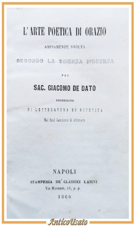 L'ARTE POETICA DI ORAZIO ampiamente svolta secondo la scienza moderna di Giacomo De Dato, professore di letteratura ed estetica nel Real Seminario di Altamura. Napoli,Stamperia de'Classici Latini, 1860.