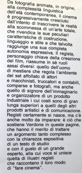 Da fotografia animata, in origine, alla complessità linguistica dell'età contemporanea, il cinema è progressivamente cresciuto: dall'intento di trascrivere la realtà alla scommessa di un'arte totale, che rivendica le sue peculiari caratteristiche di costruzione, linguaggio e stile e che talvolta raggiunge una sua completa autonomia espressiva. Il regista, personaggio chiave della creazione del film, riassume in sé ruoli assai diversi: quello dell'uomo di mestiere che regola l'ambiente del set affollato di attori e macchinisti, truccatori e contabili, comparse e fotografi, ma anche quello di signore dell'immaginario e organizzatore di un prodotto industriale i cui costi sono di gran lunga superiori a quelli degli altri prodotti artistici e di comunicazione. Registi certamente si nasce, ma c'è anche molto da imparare: è ciò che sostiene Verdone in queste pagine, che hanno il merito di trattare un argomento tanto complesso con la chiarezza espositiva di un testo di studio e con il gusto di un grande esperto, alla cui voce si unisce quella di illustri registi che raccontano il loro modo di "fare cinema".