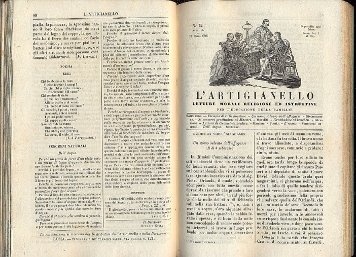 L'artigianello. Letture morali, religiose ed istruttive per l'educazione delle famiglie. Rivista settimanale diretta da Ottavio Gigli. La rivista contiene scritti su viaggi, agricoltura, scienze, astronomia ecc.
