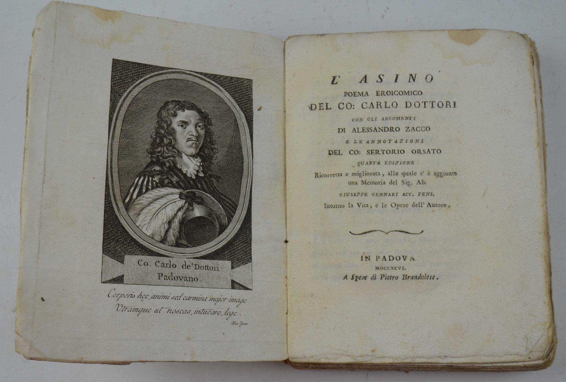 Cm. 17, pp. lvi, 342 (2). Ritratto dell'autore inciso in rame all'antiporta. Leg. coeva in cart. alla rustica parzialemente ricoperto da carta decorata. e con titolo da etichetta al dorso. Esemplare genuino e molto marginoso. Edizione stimabile di questo classico della letteratura seicentesca. Cfr. Gamba (1915): "s'aggira su un ridicolo fatto accaduto fra le due confinanti ed un tempo emule città di Padova e Vicenza.". Con frequenti accenni di interesse locale.