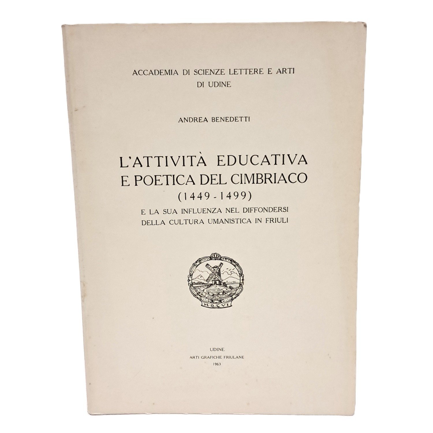 PRIMA EDIZIONE, opuscolo edito a cura dell'Accademia di scienze lettere e arti di Udine da una memoria presentata nell'adunanza del 31 gennaio 1962; La sua influenza nel diffondersi della cultura umanistica in Friuli Poeta encomiastico molto fecondo, il C. celebrò nei suoi quasi cinquemila versi in latino i rappresentanti politici e culturali delle sedi dove svolse la preminente attività di insegnante di lettere, gli avvenimenti più significativi della sua epoca, i suoi rapporti con la corte imperiale e i circoli letterari d’oltralpe (spiccano i nomi di Pietro Bonomo, Johannes Reuchlin e Konrad Celtis). Le due raccolte più impegnative comprendono i cinque poemetti degli Encomiastica e i sei delle Rapsodiae dedicati a Nicolò Donà per la sua nomina a patriarca di Aquileia, illustrata nei suoi tratti storico-geografici nel De Aquileiensi diocesi. Il C., corrispondente di letterati famosi al di fuori dell’ambito regionale, come Ermolao Barbaro il Giovane, Callimaco Esperiente e Pomponio Leto, collaborò soprattutto con gli umanisti del circolo letterario pordenonese gravitante attorno alla famiglia Mantica e con intellettuali, come Cinzio da Ceneda; elogiato da Cornelio Paolo Amalteo, suo allievo, nel carme per Raimondo Peraudi (Pérault), vescovo di Gurk, allora creato cardinale, e da Lilio Giraldi, il quale riferisce l’opinione che gli scritti del C., autore di elegie ed epigrammi, di un probabile resoconto della guerra dei Turchi contro i Rodiesi e di un epicedio per Federico III, sarebbero stati sottratti da persone invidiose, evidentemente, della sua bravura: «Fuit et Aemilianus Cymbricus poeta elegiographus in primis, cuius et epigrammata leguntur. Audivi et illum exorsum fuisse bellum Rhodiacum, quod Turcae suo tempore adversus Rhodienses gessere. Hic et epicedium in Federicum tertium imperatorem cecinit, at inique huius hominis scripta ab invidis dicuntur supprimi». In brossura. Pp. 100. Ottime condizioni.