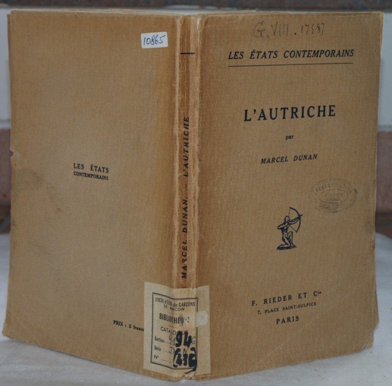 In 8. Dim. 20x13,5 cm. Pp. 128. Opera completa in un volume, uno studio sull'Austria scritto da Marcel Dunan. Nella prima parte l'autore descrive la storia dell'Austria fino al XIX secolo. Poi l'autore descrive la situazione nel periodo nel quale il libro è stato pubblicato: la popolazione (le frontiere, clima, etnografia); le istituzioni (organizzazione politica ed amministrativa, istituzioni militari); lo stato economico (ricchezze naturali, trasporti, agricoltura bestiame e foreste, commercio ed industria, banche); lettere, arti e scienze. All'interno una mappa nel testo e due planches fuori testo. Timbro di biblioteca estinto. Brossura editoriale in buone condizioni generali con lievi usure ai margini e dorso. Rare fioriture. Complete work in one volume, a study about Austria written by Marcel Dunan. In the first part the author describes the history of Austria until the XIX century. Then the author describes the situation of Austria in the period the book has been published: people (borders, climate, ethnography); institutions (political and administrative organization, military institutions); economical situation (natural goods, transports, agriculture, animals and forests, commerce and industry, banks); letters, art and science. Inside there is a map and two out-of-the-text planches. Stamp of ex library. Editorial cover in good general conditions slightly worn in the edges and spine. Occasional foxings.