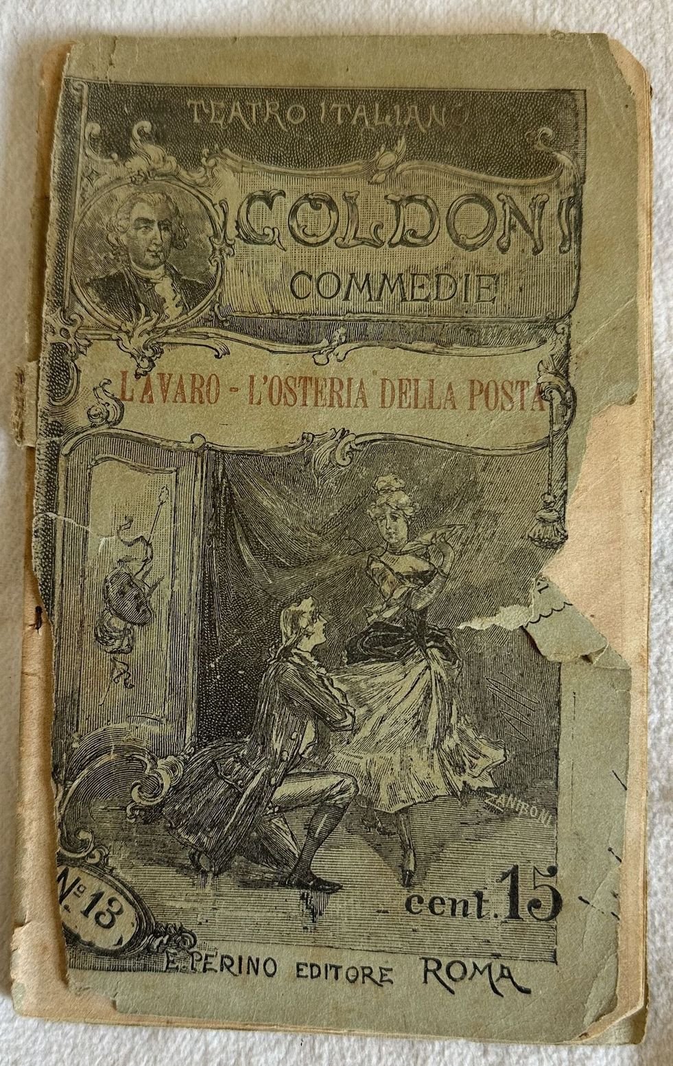 Edizione Perino del 1890 della commedia "L'avaro e l'osteria della posta" di Carlo Goldoni della collana "Teatro italiano". Sono presenti due incisioni a piena pagina, una delle quali in antiporta. In buone condizioni. Copertina editoriale in discrete condizioni con lievi usure marginali. Piatti staccati. Legatura in buone condizioni. Pagine in buone condizioni generali con fioriture. In 16. Dim. 17,5x10,5 cm. Pp. 64.Perino edition of 1890 of the play "L'avaro e l'osteria della posta" by Carlo Goldoni of the series "Teatro italiano". Inside there are two engravings, one of them in the frontspice. In good conditions. Editorial cover in fair conditions lightly worn in the extremities. Binding in good conditions. Pages are in good conditions with foxing. In 16. Dim. 17,5x10,5 cm. Pp. 64.