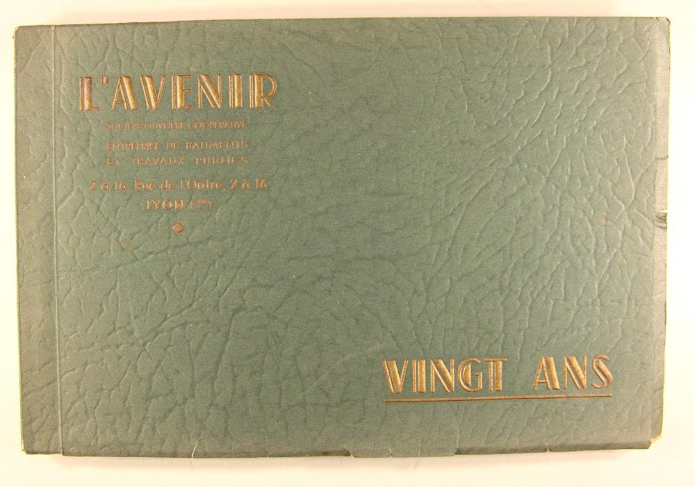 L'Avenir société ouvrière coopérative, entreprise de bâtiments et travaux publics, Lyon, 1939. Plaquette grand in/8 format l'italienne. Préface d'Édouard Hérriot. Photographies en sépia. Quelques travaux exécutés dans les diverses catégories de la profession - Administrations - Foire internationale de Lyon Poste - Hôpitaux - Villa d'habitation - Usines - Monuments aux morts - Travaux publics - Municipalités.