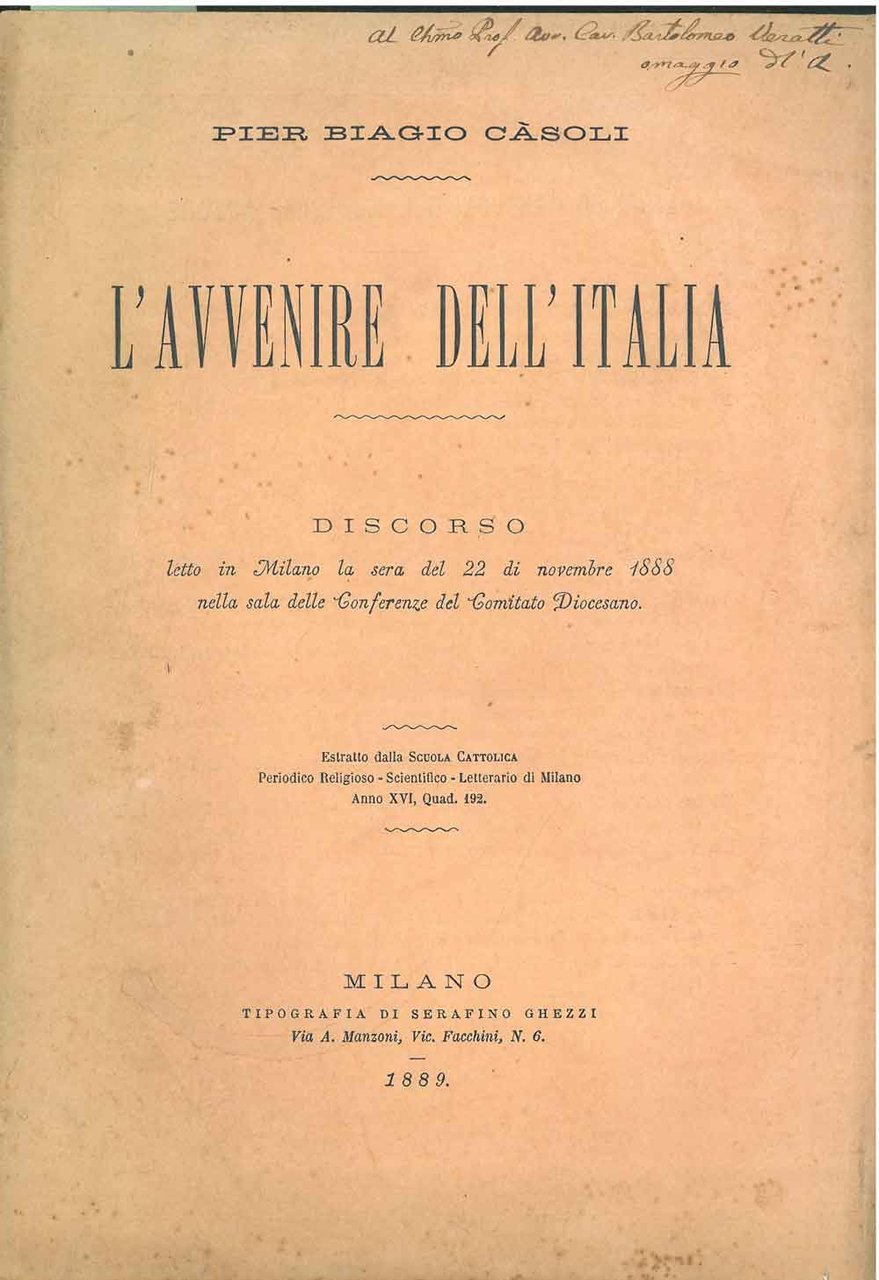 L' avvenire dell'Italia. Dirsorso letto in Milano la sera del 22 novembre 1888 nella sala delle Conferenze del Comitato Diocesano
