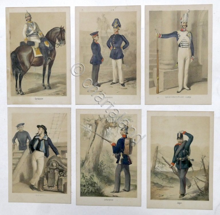 Preussische Armee in ihrer Neuesten Uniformirung Lotto 6 stampe Uniformi Esercito Prussiano, ritoccate a mano #7 Autore: Ludwig Burger - 1860 ca. Dimensioni: 10 x 15 cm ca. cad. Buone condizioni generali. Tracce di adesivo asportato sulla prima stampa.