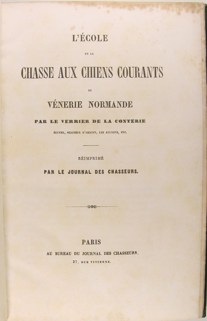Paris, Imprimerie de L. Tinterlin et Cie, au Bureau du journal des Chasseurs, 1859. In/8, reliure en demi-maroquin vert bouteille, à coins, dos à nerfs, orné de fers cynégétiques, dorée sur tête, 268 pages, bonne exemplaire grandes marges, rousseurs marginales anciennes. L'un des grand textes consacrés à la Vénerie. L'auteur, écuyer et seigneur d'Amigny, composa ce texte paru à l'origine en 1763. Le sanglier, le lièvre, le cerf ; le daim, le chevreuil le loup ; le renard, le blaireau et la loutre. Thiébaud, 590.