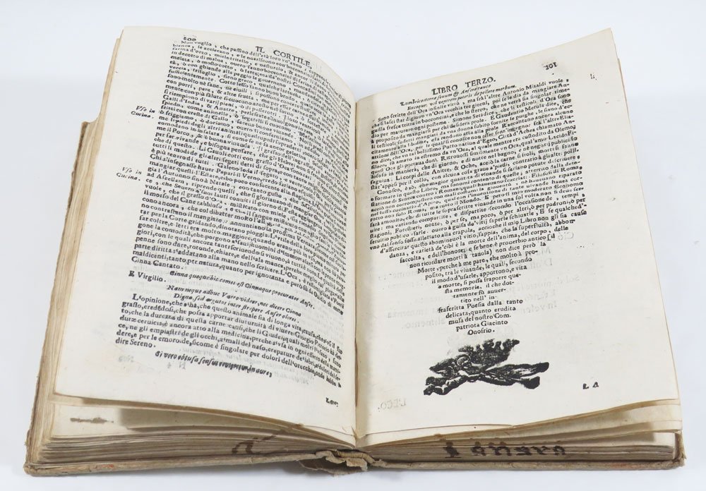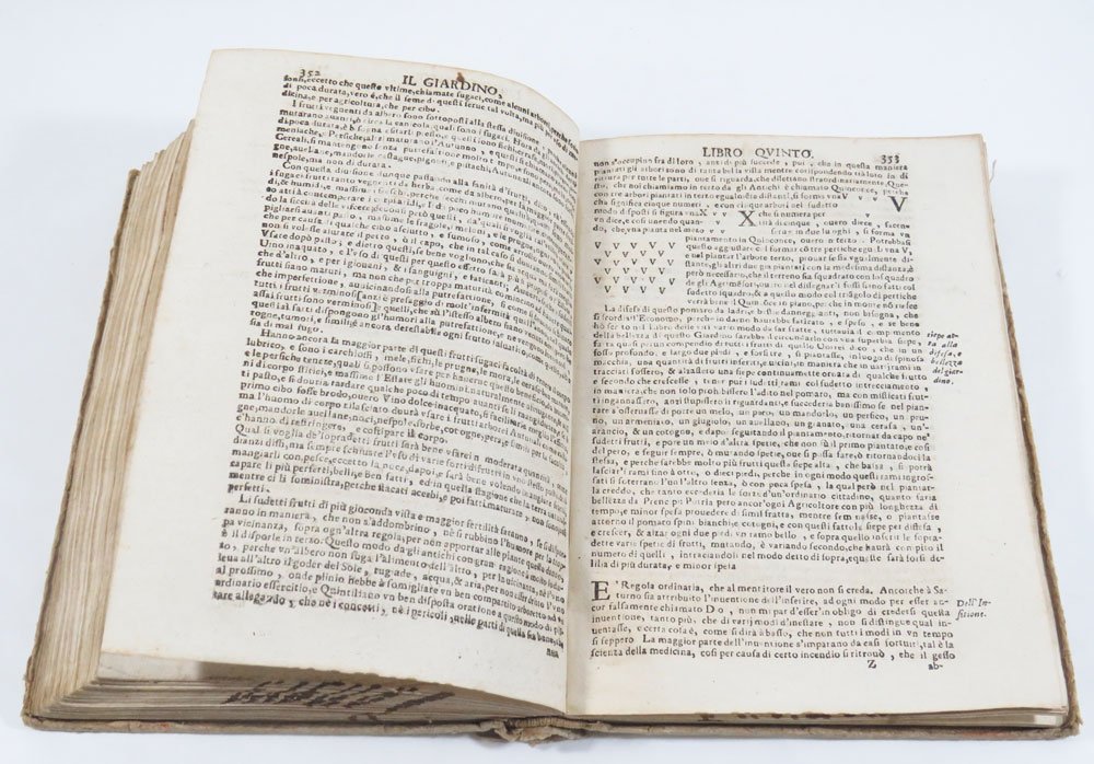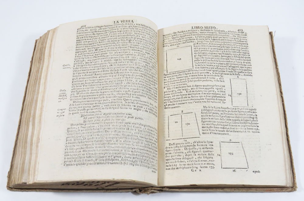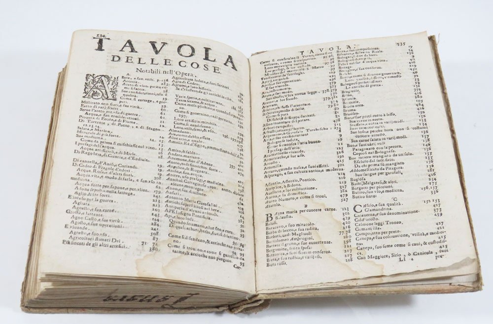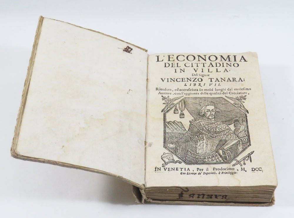LIBRO L’esemplare è legato in un cartonato rustico dell'epoca (segni del tempo e rotture lungo le cerniere, ma solido), con titolo manoscritto al dorso; sguardie coeve alla legatura, altri segni in inchiostro coevi (al primo risguardo, e al taglio basso); buoni margini, 195 x 140 mm, fresco e pulito (traccia di gora d’acqua non particolarmente deturpante alle prime e alle ultime carte). Opera classica, spesso ristampata, con capitoli riguardanti l’agricoltura e di notevole interesse i capitoli di gastronomia tra cui uno elenca i 110 modi per condire e cucinare la carne di maiale.