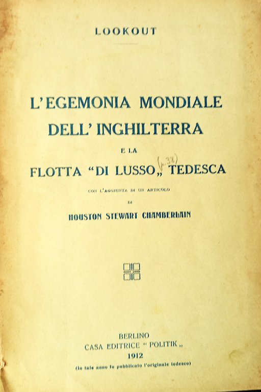 I ed. italiana (traduzione dell'originale tedesco "Englands Weltherrschaft und die Deutsche "Luxus"-Flotte von Lookout", Berlino, Casa Editrice "Politik" 1912. In-8, pp. 46+(2), brossura fermata al dorso con punto metallico composta in cartoncino grigio-verde con titoli in blu. Stato discreto (copertina bruniita in particolare ai margini - margini della copertina consunti e con piccoli strappi - pagine brunite in particolare ai margioni e con qualche fioritura - alcuni appunti e sottolineature a matita nelle pagine e in copertina, tutti rimovibili). Contenuto: Prefazione; Lookout (Berlino, 21 febbraio 1912) - Sognatori e realtà - Il "Gentleman" inglese - "La perfida Albione" - La lista delle nostre lagnanze - Rule Britannia - Il periodo di guerra nel 1911 - Allettamenti di un tempo e di oggi - Ciò di cui abbiamo bisogno -- "Articoli sulla guerra"; di H. St. Chamberlain scelti (Prefazione (Bayreuth, 28 ottobre 1914) - L'amore dei tedeschi per la pace (Bayreuth, 2 settembre 1914).
