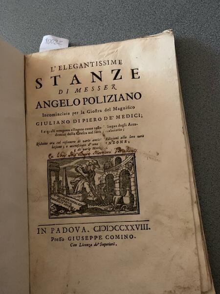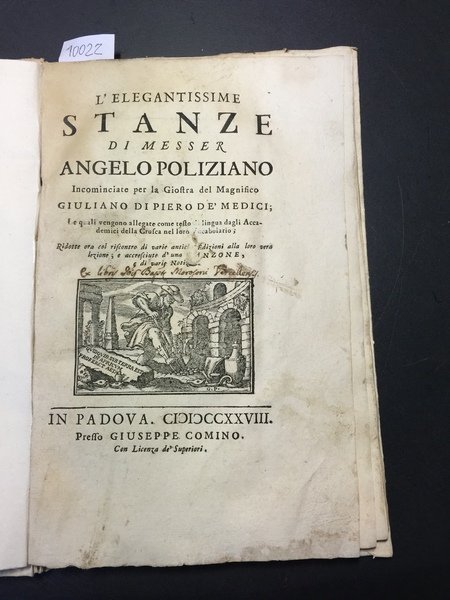 L'ELEGANTISSIME STANZE di Messer Angelo Poliziano Incominciate per la Giostra del Magnifico Giuliano di Piero de' Medici; Le quali vengono allegate come testo di lingua dagli Accademici della Crusca nel loro Vocabolario; Ridotte ora col riscontro di varie antiche Edizioni alla loro vera lezione; e accresciute d'una Canzone, e di varie notizie