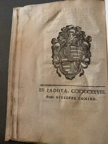 Un volume in 8 cm. 21x13,6 pp. VIII-48 Cartonato rustico antico rimontato Frontespizio con incisione xilogr. della celebre marca tipografica (un contadino che scava in profondità tra rovine antiche, col motto 'Quidquid sub terra est in apricum proferet aetas'); capilettera testalini xilogr. In fine elaborato stemma xilograf. a p.pag. Solamente leggerissima brunitura uniforme della carta , ma ottimo esemplare pulito e fresco di questa rara prima edizione cominiana già elencata al n 9 degli “Annali della Tipografia Volpi- Cominiana del 1809” come “rara e stimatissima”.