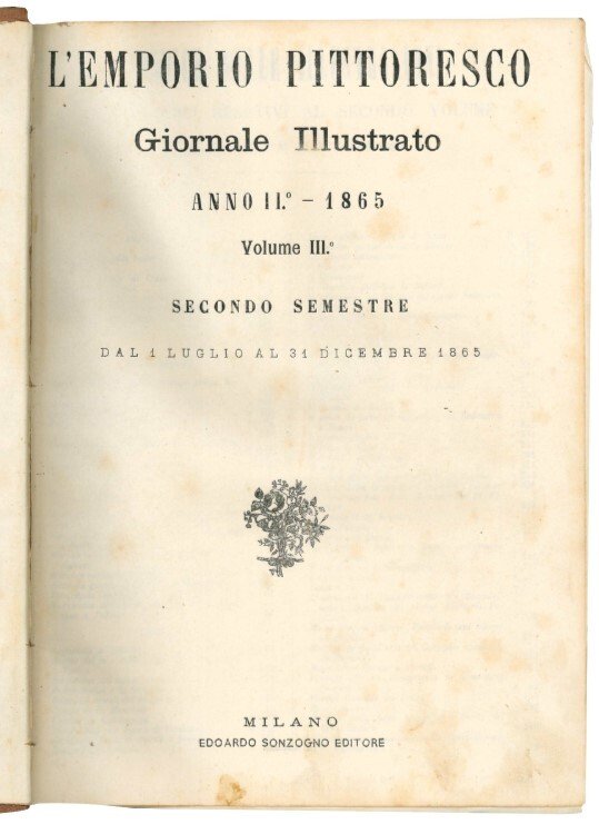 Mm. 298x212. Pp. 16 per ogni dispensa del secondo semestre 1 luglio-31 dicembre 1865. Con numerose xilografie, anche in doppia pagina, pubblicità e testo su tre colonne. Le prime cc. risultano parzialmente staccate. Rilegato editoriale in mezza tela con titolo in oro al dorso (lievi mancanze alle cuffie). Prima edizione.