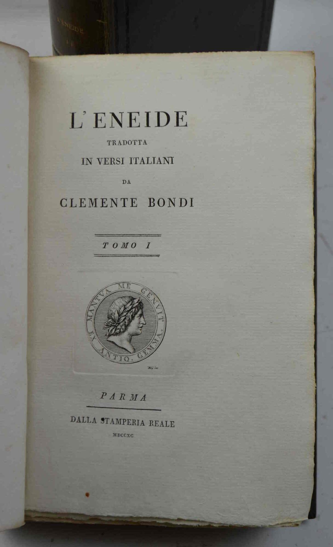 Due volumi di cm. 23, pp. (8) xxiii (1) 273 (1); 295 + (3) con l'errata. Ritratto di Virgilio entro medaglione ai due frontespizi. Solida ed elegante legatura d'amatore in piena pelle novecentesca, dorsi lisci con titoli in oro e fregi a secco, piatti inquadrati da fregi impressi. Esemplare particolarmente marginoso, con barbe e testimoni ed impresso su carta di ottima qualità. Elegante edizione bodoniana, cfr. Brooks 400.