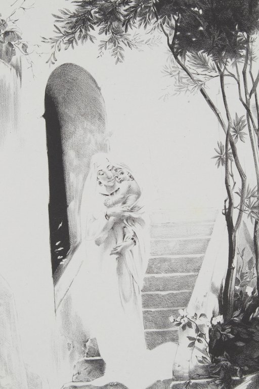 Imprimerie Champenois • pour CH. Masson • H. Piazza | Paris (Avril 1899) | 20.50 x 31.50 cm | une feuille | [ENGLISH DESCRIPTION ON DEMAND] | Rare lithographie originale, exécutée par Guillaume Dubufe pour L'Estampe Moderne, série numéro 24 publiée en avril 1899. Une des 50 épreuves de grand luxe tirées sur Chine à grandes marges, signature de l'artiste dans la planche, timbre à sec de l'éditeur représentant un profil d'enfant en marge inférieure, contrecollée sur un feuillet de papier vélin avec au dos le tampon numéroté du tirage de luxe, quelques rousseurs et petit manque angulaire. Lithographie inspirée d'un extrait de La maison d'exil de Guillaume Pilon. Magnifique publication mensuelle française éditée entre mai 1897 et avril 1899, L'Estampe moderne se constitue de chromolithographies inédites qui, contrairement à d'autres revues comme Les Maîtres de l'Affiche et tel qu'il est stipulé sur les serpentes, ont été réalisées spécialement par chaque artiste pour la revue. Ce sont ainsi 100 estampes qui paraissent au total, couvrant les courants artistiques majeurs de la fin du XIXème siècle : Symbolisme, Art Nouveau, Préraphaélites, Orientalistes et Belle Epoque. Chaque livraison de quatre estampes est tirée à 2000 exemplaires vendus 3,50F et 100 sur papier Japon proposés à 10F. Henri Piazza prévoit également un tirage confidentiel de très grand luxe : 50 exemplaires sur Japon à grandes marges et 50 en noir sur Chine au prix considérable de 30F. Cette estampe d'un beau format est superbement imprimée sur l'un des plus prestigieux papiers : le Chine. « Malgré toutes ses qualités, le papier de Chine, trop inconsistant, doit sa réputation, non pas à sa propre beauté, mais bien à ses affinités particulières avec l'encre d'impression. Son tissu, lisse et mou tout ensemble, est plus apte qu'aucun autre à recevoir un beau tirage. Cette propriété fait rechercher le papier de Chine pour le tirage des gravures. » (Anatole France). L'intérêt des collectionneurs français pour les affiches artistiques s'amplifie au début des années 1890. Octave Uzanne, pour qualifier cette fièvre invente le terme d'« affichomanie ». L'affiche, à l'origine populaire et placardée dans les rues de la capitale, devient alors objet d'art et son support éphémère se fait précieux et voué à la conservation. Piazza décide de soustraire l'affiche à sa vocation publicitaire et de l'élever au rang d'œuvre d'art à part entière au même titre que le livre illustré de luxe. Il compose ainsi une collection prestigieuse d'œuvres entièrement originales, par les artistes européens les plus en vue du moment : Georges de Feure, Eugène Grasset, Henri Detouche, Emile Berchmans, Louis Rhead, Gaston de Latenay, Lucien Lévy-Dhurmer, Gustave-Max Stevens, Charles Doudelet, Hans Christiansen, Henri Fantin-Latour, Steinlen, Ibels, Engels, Willette, Henri Meunier, Evenepoël, Bellery-Desfontaines, Charles Léandre, etc. Bel exemplaire.