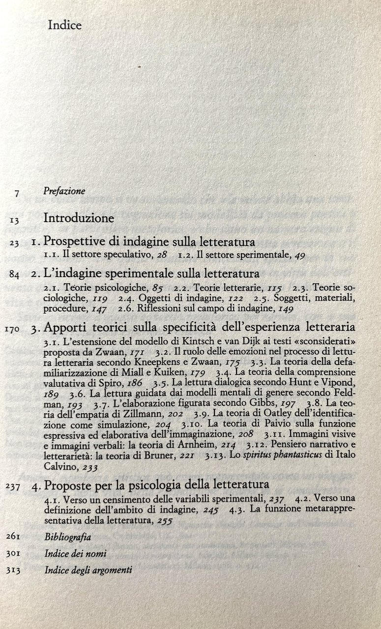 Gli autori hanno svolto un'indagine conoscitiva nel campo genericamente denominabile psicologia della letteratura, con il duplice obiettivo di verificarne lo stato attuale e di rintracciare gli elementi teorici e concettuali che possono contribuire a delinearne lo statuto, convinti che essa debba ricevere, nell'ambito della psicologia, una collocazione adeguata al notevole contributo che può apportare alla comprensione del pensiero e del comportamento umani. Nei primi due capitoli vengono esaminati i vari e diversi approcci psicologici alla letteratura, e in particolare l'indagine sperimentale e gli studi di matrice cognitivista, nonché alcune teorie maggiormente attinenti alle peculiarità dell'esperienza letteraria. Il terzo presenta alcuni apporti teorici che si distinguono per la loro pertinenza all'esperienza letteraria. Infine, il quarto capitolo propone alcune considerazioni sullo stato dell'arte della psicologia della letteratura, nell'intento di fornire un contributo al consolidamento e alla crescita della disciplina, prospettando un percorso che potrà portare a un ordinamento dei suoi costrutti portanti e indicando le linee teoriche che concorrono alla definizione del suo ambito di indagine.