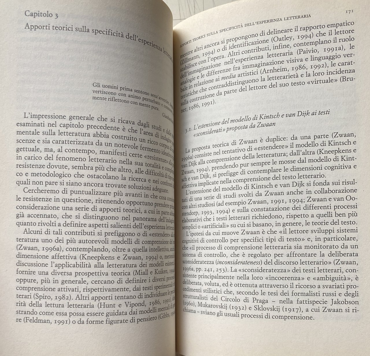 Soggetti: Università, Psicologia cognitiva, Linguistica testuale, Letteratura, Educazione, Scienze sociali, Formazione, Scuola, Teorie letterarie, Critica letteraria, Interpretazione, Semantica, Segni, Semiologia, Semiotica, Generi letterari, Figure retoriche, Poesia, Racconto, Romanzo, Lettura, Scrittura, Struttura, Poetica, Linguaggio, Rolf A. Zwaan, Estetica, Jerome S. Bruner, Walter Kintsch, Teun A. van Dijk, David S. Miall, Donald Kuiken, van Peer, D. Vipond, Vygotskij, Van Den Broeck, Metafora, George Lakoff, S.F. Larsen, J. Laszlo, Kneepkens, Affettivi Artistico Attività Caso Causale Cognitive Compito Complesso Comportamento Comprensione Concetti Confronti Conoscenza Contenuto Differenze Discorso Elaborazione mentale Elementi Emozioni Esperienze Eventi Figurato Forme Funzione generale Genere Immagini Indagine Informazioni Journal Lavoro Leggere Lettore Livello Memoria Modello Narrativa Opere Parole Pensiero Personaggi Risonanza personale, Poetico Press Procedimenti Processo Prospettiva Rapporto Rappresentazione Reading Relazione Ricerca Ricordi Riferimento Risposta Risultati Ruolo schemi Senso Sentimenti Serie Significato Sistema Situazione sociale Sperimentale Storia Studi Sviluppo Teoria Teorici Termini Testi letterari Tipi Valutazione, Affetto, Causalità, Coerenza, Ragionamento, Creatività, Discorso, Analisi, Empatia, Immaginazione, Inferenza, Percezione, Metodo, Didattica, Pattern, Stile, Tono, Straniamento, Ipertesto, Rand J. Spiro, Tolstoj, D. Zillmann, Jan Mukařovský, Darcia Narvaez, Keith Oatley, Omero, Allan Paivio, N. Person, Marcel Proust, L. Rohleder, L.M. Rosenblatt, Rumelhart, William Shakespeare, U. Seilman, S.J. Schimdt, M. Sadoski, V. Sklovskij, T. Trabasso, V. Propp, Klein, J.P. Magliano, M.S. Lindauer, E.H. Lichtenstein, Thomas Mann, Eugenio Montale, Herman Melville, Fitzgerald, Gustav Theodor Fechner, Goethe, C.H. Frederiksen, Sigmund Freud, R.J. Gerring, Garcia Lorca, R.W. Gibbs, L. Halasz, A.C. Graesser, E.T. Goetz, G. Hansson, Hemingway, N.N. Holland, Hesse, James Joyce, Corneille Henri Kneepkens, Giulio C. Lepschy, Kafka, R. Jakobson, W. Iser, Ibsen, R.A. Hunt, Huxley, W.F. Brewer, Blake, Coleridge, Carroll, Italo Calvino, Derrida, Dewey, Dickens, Dickinson, Dijkstra, C.F. Feldman, Faulkner, Eliot, Esopo, Eckardt, Umberto Eco, Dostoevskij, Borges, Dante Alighieri, Ariosto, Aristotele, Roland Barthes, W.B. Bagett, M. Balint, Charles Baudelaire, Robert-Alain de Beaugrande, Bellamy, Bellini, Berlyne, Sociologia, Rudolph Arnheim, Jensen, Bambini, Defamiliarizzazione, Simulazione, Identificazione, Fantasia, Letterarietà, Spiritus phantasticus, Studi culturali, Consultazione, Bibliografia, Saggi, Libri fuori catalogo, Alberto Savinio, Inconscio, Tagensansicht, Nachtansicht, Graesser, Britton, Produzione, Lindauer, Arte, Approccio, Expertise, Narratore, Flashbulb, Iperbole, Tassonomia, Sineddoche, Metonimia, Iperbole, Ironia, Similitudine, Mitigazione, Fiaba, Favola, Fabula, Sociologiche, Bourdieu, Imagery, Categorie, Inferenze, Morfologia, Costruzione, Grammatica, Testo, Mnemotecnica, Aggancio, Feldman, Bachtin, Zizek, University Cognitive psychology Textual linguistics, Literature Education Social sciences Training School Literary theories criticism Interpretation Semantics Signs Semiology Semiotics Literary genres, Rhetorical figures Poetry Short story Novel Reading Writing Poetic structure Language Aesthetics Affectives Artistic Activity Case Causal Cognitive Task Complex Behavior Comprehension Concepts Comparisons Knowledge Content Differences Speech Mental processing Elements Emotions Experiences Events Figurative Forms General function Genre Images Investigation Information Reading Reader Level Memory Model Narrative Works Words Thought Characters Personal resonance Poetic Procedures Process Perspective Relationship Representation Reading Report Research Memories Reference Response Results Role Sense Feelings Series Meaning System Situation Experimental History Development Theory Theoretical Terms Literary texts Types Evaluation Affect Causality Coherence Reasoning Creativity Discourse Analysis Empathy Imagination Inference Perception Method Didactic Style Tone Estrangement Hypertext Homer Aesop Aristotle Sociology Children Defamiliarization Simulation Identification Fantasy Literary Cultural studies Consultation Bibliography Essays Books out of print Unconscious Production Approach Narrator Hyperbole Taxonomy Synecdoche Metonymy Hyperbole Irony Simile Mitigation Fairy Tale Fable Categories Inferences Morphology Construction Grammar Mnemotechnics Connection