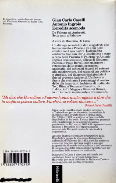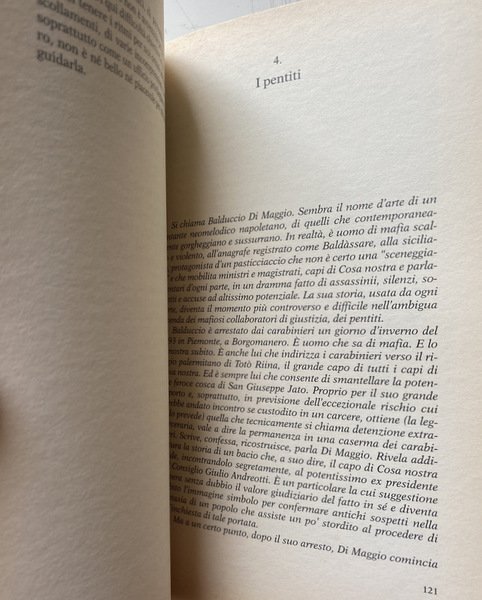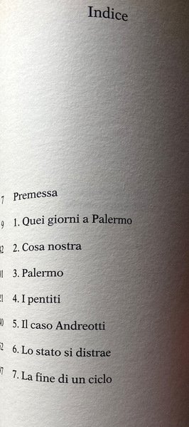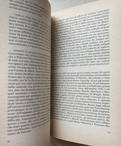 Soggetti: Criminalità organizzata, Criminologia, Scienze sociali, Società, Politica, Governo, Processi politici, Diritto, Sistema legale, Tribunali, Procedimenti, Magistratura, Procura antimafia, Mafia, Cosa Nostra, Cosche mafiose, Famiglie, Clan, Sicilia, Affari, Droga, Traffico di stupefacenti, Corruzione, Collusione, Associazione mafiosa, Capi, Iniziazione, Omertà, Indagini, Inchieste, Attualità, Maxiprocesso, Giudici, Omicidi eccellenti, Attentati, Strage, Anni Novanta, Anni Ottanta, Anni Settanta, Marsala, Palermo, Caltanissetta, Trapani, Democrazia Cristiana, DC, Fratelli Ignazio Antonino Salvo, Salvo Lima, Testimoni, Collaboratori, Pentiti, Pentitismo, Potere, Massoneria, Paolo Borsellino, Giovanni Falcone, Scorta, Testimonianze, Biografie, Memorie, Istruttoria, Storia d'Italia, Leggi, 41 Bis, Carcere duro, Legalità, Condanne, Terrorismo, Pool, Dossier, Segreto di Stato, Terzo livello, Boris Giuliano, Liggio, Pietro Giammanco, Scorta, Bacio, Assise, Appello, Cassazione, Sentenze storiche, Confessioni, Giovanni Brusca, Attentatuni, Tritolo, Rifiuti tossici, Armi, Bombe, Pietro Grasso, Anni Duemila, Stagione stragista, Blitz, Covi, Latitanti, Ricercati, Cultura, Gangster, Isolamento, Vertici, Gerarchia, Carlo Alberto Dalla Chiesa, Polizia, Saggistica, Libri Vintage fuori catalogo, Bestsellers, Maurizio Costanzo, Via Fauro, Giuseppe D'Avanzo, Corriere della Sera, Antonino Caponnetto, Apparati deviati, Relazioni pericolose, Giuseppe Ayala, Capaci, Mattanza, Luciano Violante, Commissione Stragi, Codice di procedura penale, Roberto Scarpinato, Domenico Gozzo, Guido Lo Forte, Gioacchino Natoli, Alfonso Sabella, Boss mafiosi, Giuseppe Graviano, Leoluca Bagarella, Pasquale Cuntrera, Gaspare Spatuzza, Pietro Aglieri, Vito Vitale, Tangentopoli siciliana, Prescrizione, Reati, Associazione a delinquere, Marcello Dell'Utri, Forza Italia, Silvio Berlusconi, Firenze, Roma, 'Ndrangheta, Camorra, Napoli, Corrado Carnevale, Pino Arlacchi, SISMI, Nicolò Pollari, Servizi segreti, Organized crime, Criminology, Social sciences, Society, Politics, Government, Political trials, Law, Legal system, Courts, Proceedings, Judiciary, Anti-mafia prosecutor, Gangs, Families, Sicily, Business, Drugs, Drug trafficking, Corruption, Collusion, Mafia association, Leaders, Initiation, Investigations, Inquiries, News, Maxi Trial, Judges, Excellent murders, Attacks, The Nineties, The Eighties, The Seventies, Christian Democracy, Witnesses, Collaborators, Pentiti, Repentism, Power, Freemasonry, Escort, Testimonials, Biographies, Memoirs, Preliminary Investigation, History of Italy, Laws, Hard Prison, Legality, Convictions, Terrorism, State Secrets, Third Level, Escort, Kiss, Assizes, Appeal, Cassation, Historical Sentences, Confessions, Tritolo, Toxic waste, Weapons, Bombs, 2000s, Massacre season, Lairs, Fugitives, Wanted, Culture, Isolation, Top management, Hierarchy, Police, Non-fiction, Out-of-print books, Deviated systems, Dangerous Liaisons, Mattanza, Massacre Commission, Procedure Code, Mafia Bosses, Sicilian Tangentopoli, Prescription, Crimes, Criminal Association, Florence, Rome, Naples, Secret Services