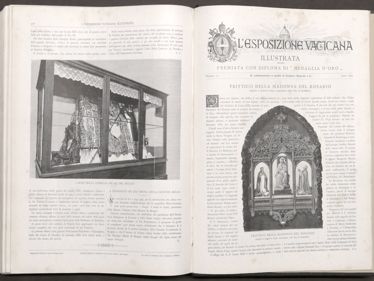 L'esposizione vaticana illustrata - Periodico ufficiale per la commissione promotrice - Premiato con diploma di medaglia d'oro L’esposizione vaticana illustrata: periodico ufficiale per la commissione promotrice: premiato con diploma di medaglia d’oro. Serie prima. Serie I (N. 1 (1887) - N. 40 (1888)) Serie II (N. 41 (1888) - N. 70 (1890)). Casa editrice: Gustavo Bianchi e C. editori, Roma. Contiene centinaia di incisioni dei capolavori esposti nel testo e f.t. Copertina rigida muta non coeva - Testo in italiano. Condizioni generali molto buone. Legatura e sguardie rifatte. Piccoli strappi e restauri al bordo superiore dell'ultima tavola.