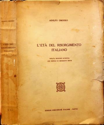 Ottava edizione riveduta con profilo di Benedetto Croce. In 8° (cm 26 x 16), pp. [XIX] + 550. Bross. Tit. marrone al dorso beige brunito. Segni di consunzione, strappetti e piccole mancanze ai margini e alle cuffie. Tagli bruniti. Pagine rifilate. Macchie al dorso. Tracce di polvere. Buone condizioni.
