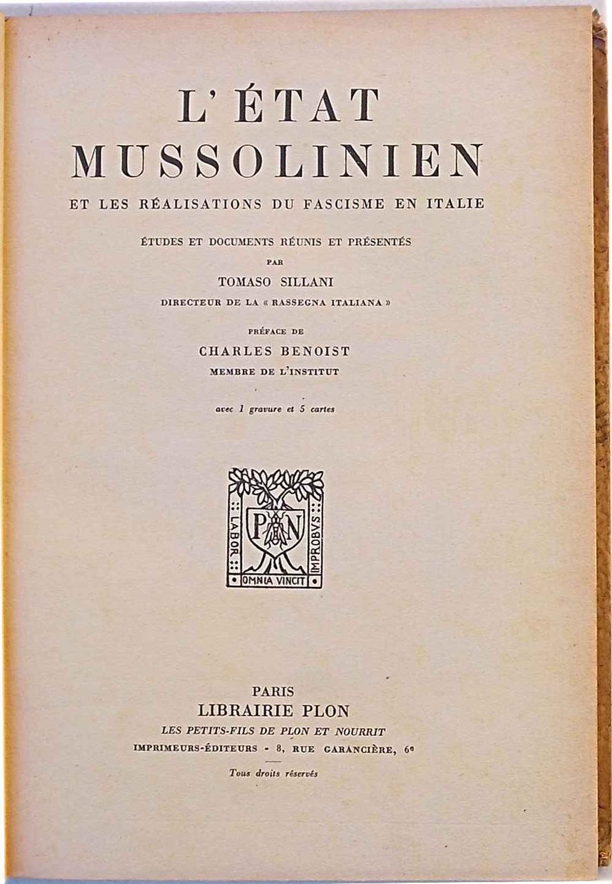 In 8° (cm. 24 x 17,5); pagg. 379; con 1 tavola e 5 carte f.t.; cartonatura dell'epoca decorata e con tassello. VG-. ** Prefazione di Charles Benoist all'edizione francese. Il titolo originale italiano è "Lo Stato Mussoliniano e la realizzazione del Fascismo nel Paese."