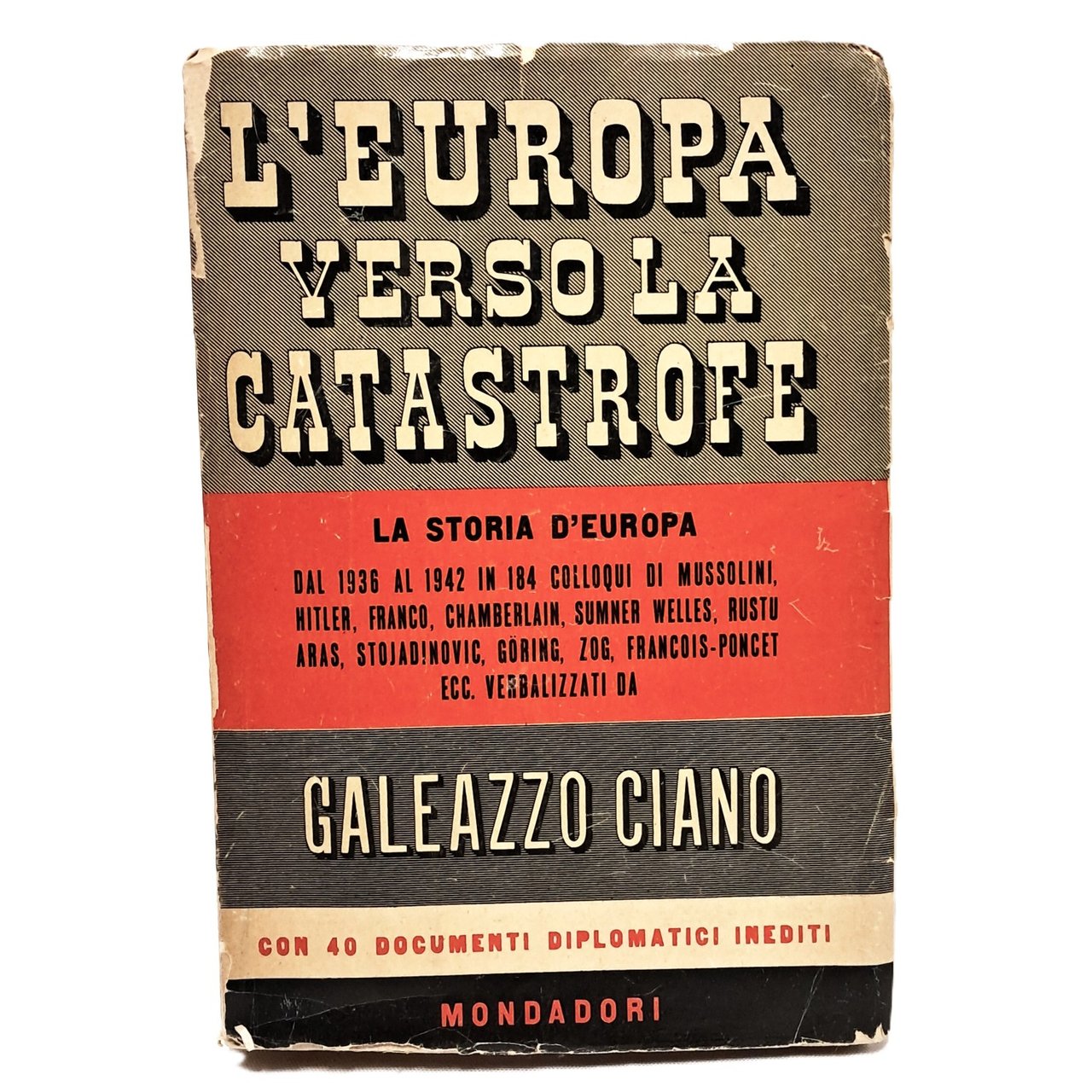 PRIMA EDIZIONE La storia d'Europa dal 1936 al '42 in 184 colloqui con Mussolini, Hitler, Franco, Chamberlain, Summer Welles, Rustu Aras, Stoiadinovic, Goring, Zog, Françoios Poncet ecc; con 40 documenti diplomatici inediti. In brossura. Piccoli segni di usura sulla copertina. Pp. 722.