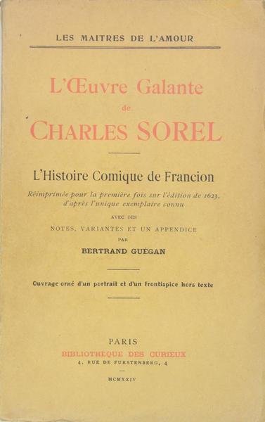 Paris, Bibliothèque des curieux, 1924. Grand in/8 (23 x 14 cm) broché, couverture imprimée, un frontispice, 282 pages. Exemplaire en partie non coupé. Ouvrage orné d'un portrait et d'un frontispice hors texte en noir. Collection les maîtres de l'amour. Réimpression de l'édition de 1623 d'après l'unique exemplaire connu, avec des notes, variantes et un appendice par Bernard Guégan.